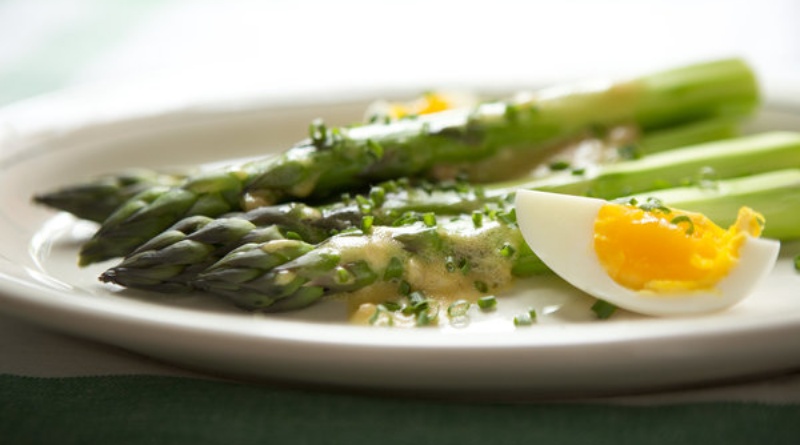Fresh spring asparagus topped with a tangy vinaigrette and eggs is the perfect dish to start the meal.