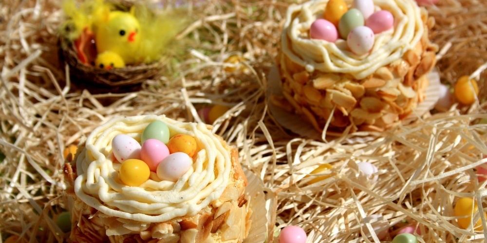These mini pastries are decorated like birds’ nests– made with almond cake and topped with icing ribbons and chocolate eggs.