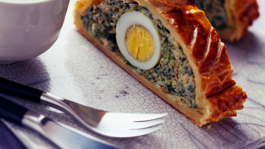 This is a French dish meant to symbolize new life and fresh growth, using tender spring greens like spinach and nettles– which are then enrobed in flaky pastry and baked with a hard-boiled egg in the middle.
