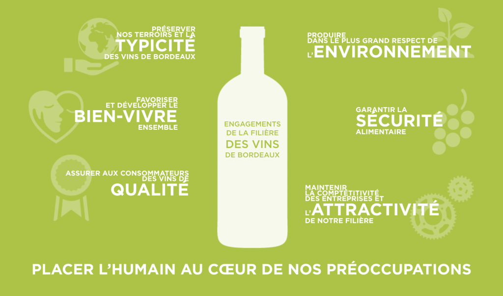 Le vignoble bordelais est le premier vignoble de vins fins de France, et bénéficie d’un terroir exceptionnel. Pour Bernard Farges, Président du Conseil Interprofessionnel du Vin de Bordeaux, « ce statut lui donne des droits mais génère des devoirs ! ». Depuis de nombreuses années, tous les acteurs du vin de Bordeaux s’engagent pour le développement durable. Une filière responsable, rassemblée autour de mêmes valeurs. Notre objectif ? Préserver notre environnement, notre terroir, sa qualité et placer l’humain au cœur des préoccupations. Notre stratégie s’articule aujourd’hui autour de quatre axes majeurs.