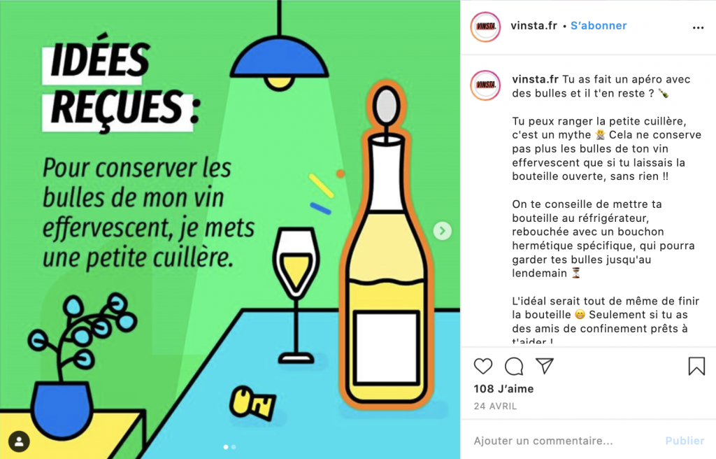 Petit nouveau sur instagram, Vinsta vous donne des infos sur le vin de manière ludique et claire. Vous souhaitez faire le plein d’anecdotes pour votre prochain apéro ? Suivez-les et vous trouverez une mine d’infos.