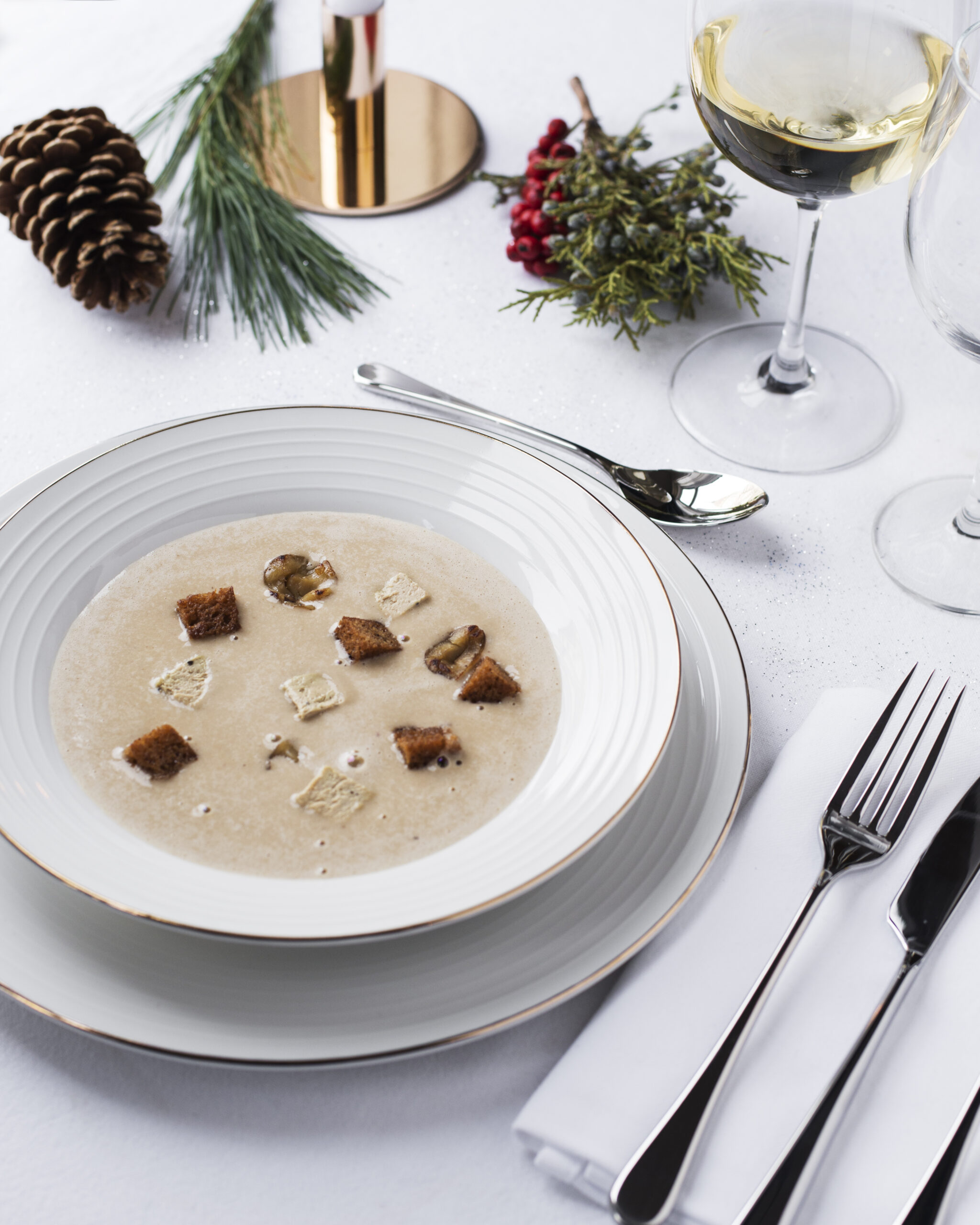 Pour éviter à vos convives de se gaver de pain et de caler avant la fin de l’entrée, ou bien pour leur offrir une assiette nettement plus sympathique que les deux traditionnelles tranches de foie gras tristement isolées : misez sur le bol. On remplit ce dernier d’un délicieux velouté de foie gras et châtaignes, dans lequel (parce que toute gourmandise est permise à Noël), on ajoute des petits dés de foie gras. Le tout accompagné de tranches de pain d’épices grillé.