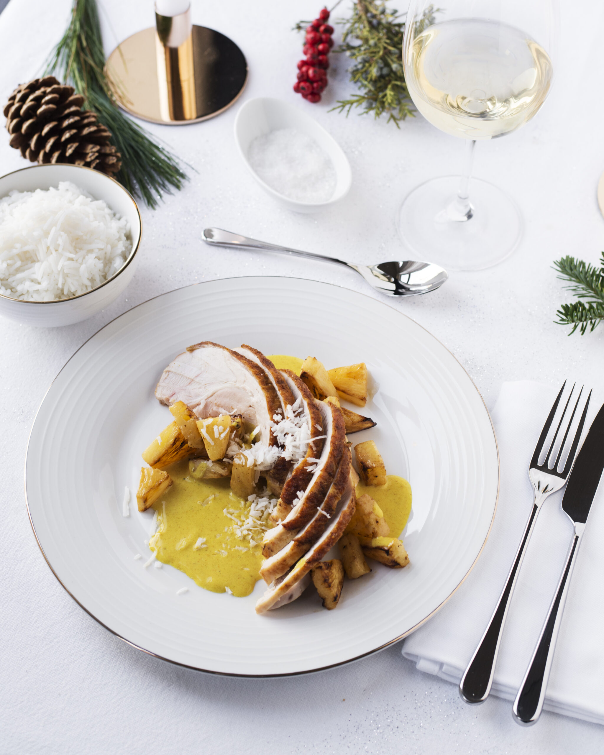La dinde aux marrons mérite elle aussi un petit coup de fouet. Alors, quoi de mieux pour envouter vos convives que de les faire voyager… La dinde prend des accents thaïlandais, avec une sauce curry-coco et des dés d’ananas par exemple.