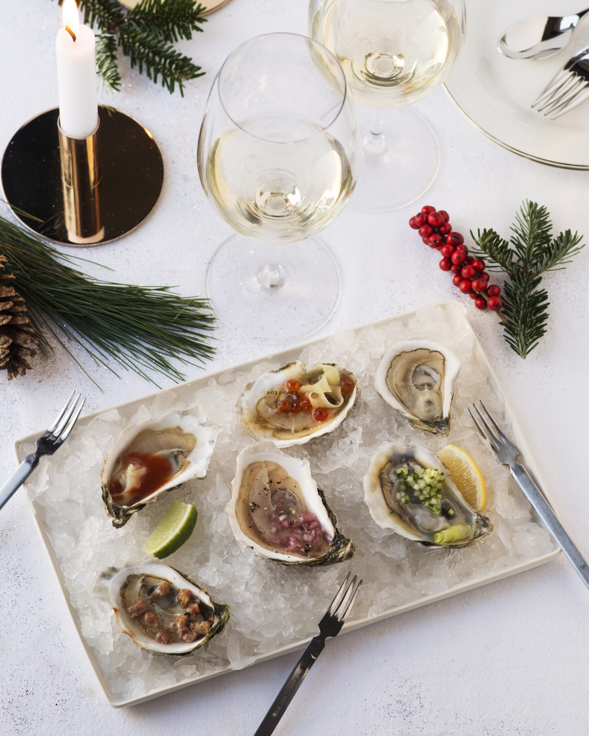 D’ordinaire on partirait sur un vin blanc sec, mais si l’originalité ne vous effraie pas (ni vos convives) essayez de marier les huîtres avec un vin blanc moelleux, à servir frais, de l’appellation Sainte-Croix-du-Mont. Un peu de douceur dans ce monde d’iode.