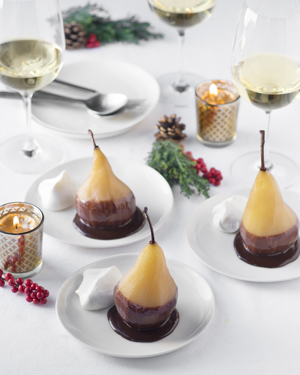 Poires pochées au chocolat pour le dessert, accompagnées d’un verre de blanc doux de Loupiac, le summum de la gourmandise.